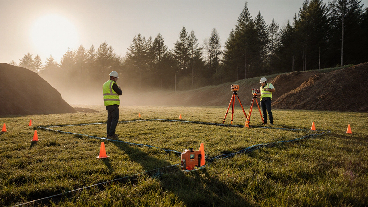 - Геодезическая разметка. Специалисты используют GPS‑приёмники и нивелиры, чтобы точно обозначить контуры будущего котлована на местности.