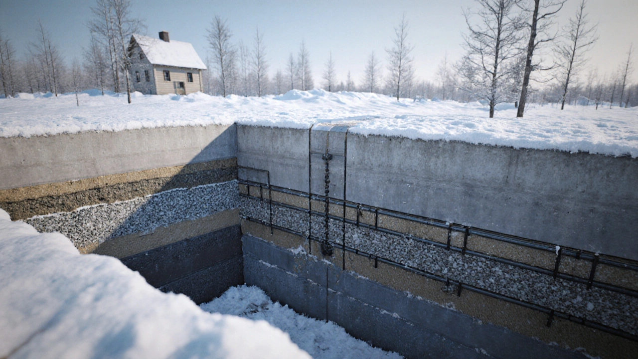 Заглублённый ленточный фундамент - это надёжно, но дорого. Требуется копать траншею на 1,5-2 метра, устраивать подушку из песка и щебня, армировать, заливать бетон. Но он выдерживает любые нагрузки, включая сильное пучение грунта. Подходит для тяжёлых домов и участков с пучинистыми грунтами.